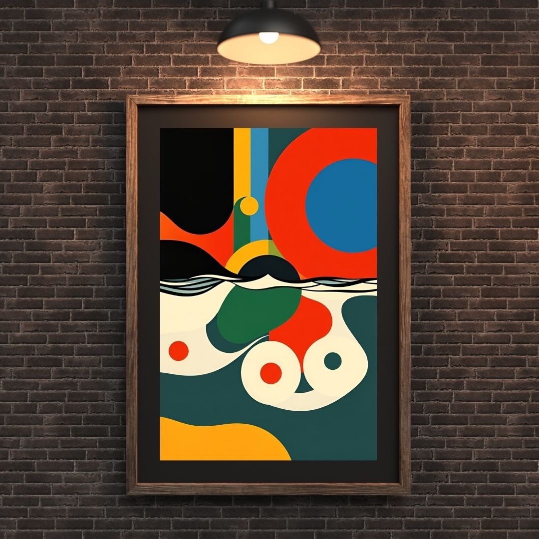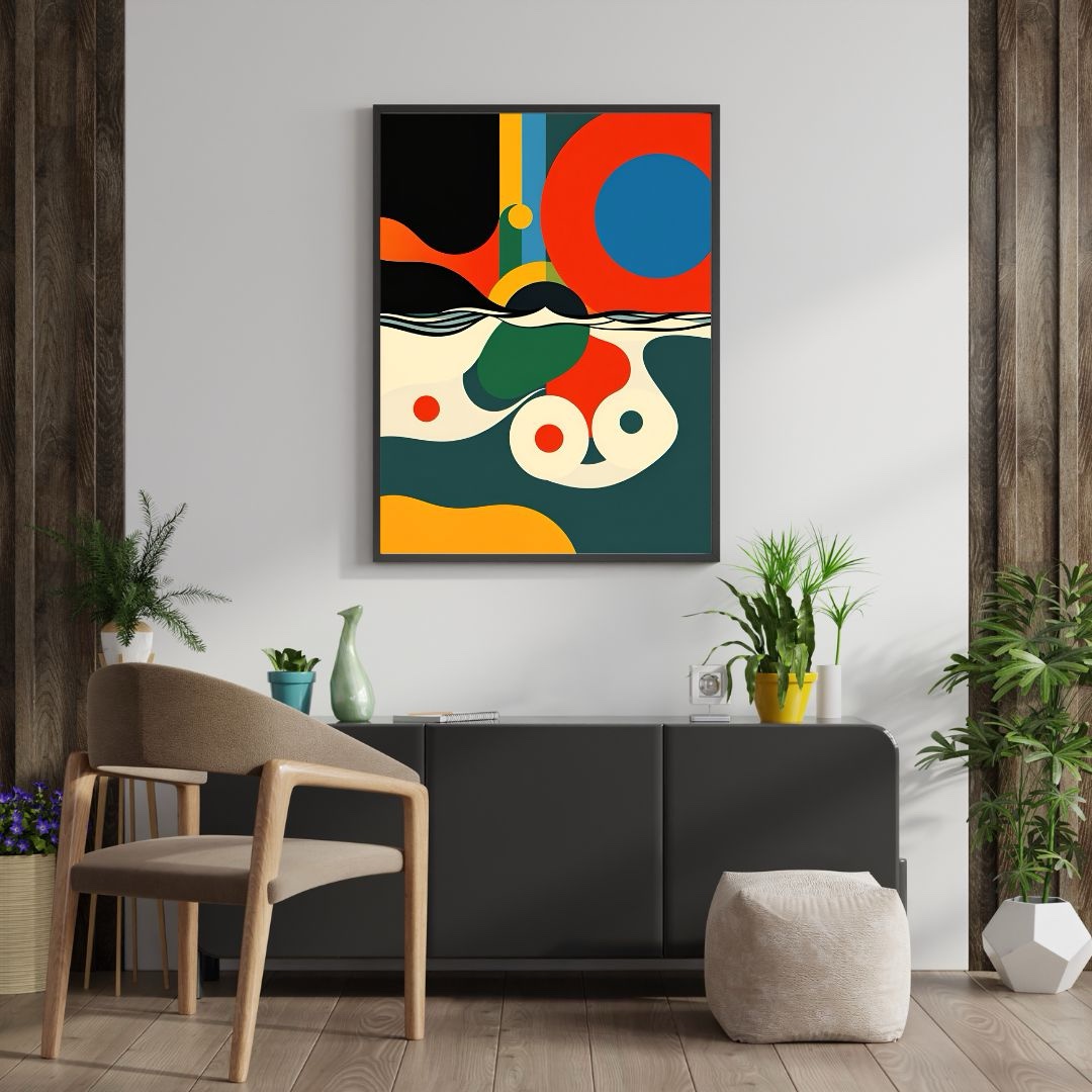 Where sea meets sky, and rhythm meets ripple — High Tide Halos is a visual voyage across two worlds. A bold red circle rises like a surreal sun over a horizon split in balance, with swelling waves and soft currents below. Color blocks in teal, yellow, crimson, and cream flow like tide pools in a geometry daydream. This piece hums with calm and chaos — a modern ode to oceans both literal and emotional.