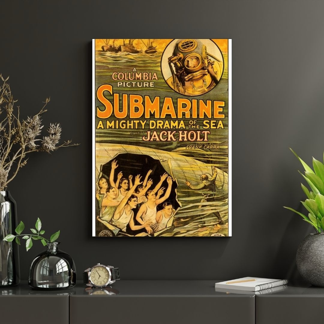 Prepare to dive deep into cinematic history with this breathtaking vintage movie poster for Submarine, a Columbia Picture directed by the legendary Frank Capra and starring Jack Holt. Bursting with golden-orange and deep-sea greens, the artwork captures the sheer drama and intensity of a daring underwater rescue. The distressed, desperate faces of the trapped submariners contrast powerfully with the calm determination of the deep-sea diver approaching the wreck. The inset portrait of a diver in full 1920s-era suit completes this bold and heroic composition.