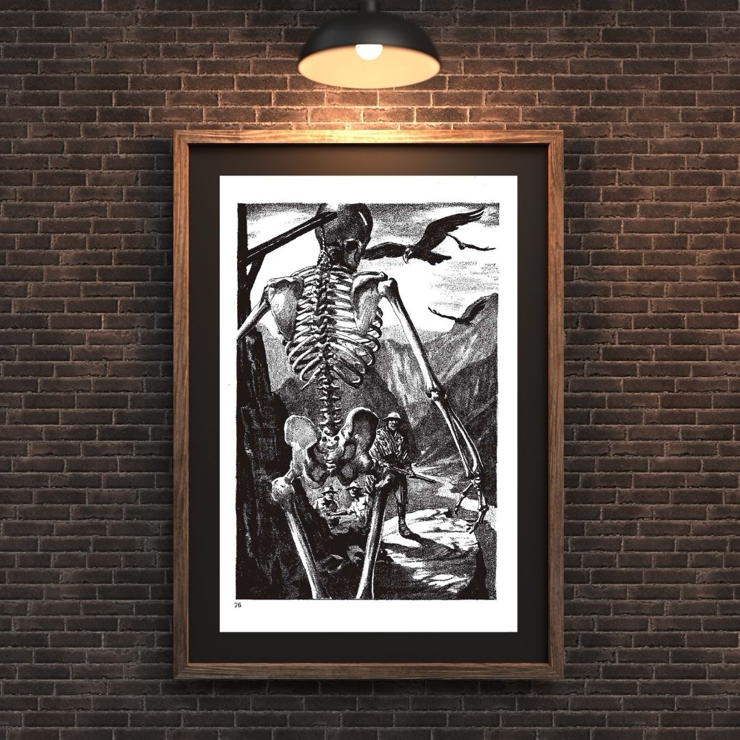 Step into the eerie world of pulp horror with this haunting vintage-style illustration. The image features an enormous, towering skeleton looming ominously over a group of explorers in a dark, mountainous ravine. Vultures circle the desolate sky, and the gritty, stippled ink work gives the scene an authentic mid-20th-century horror pulp vibe.