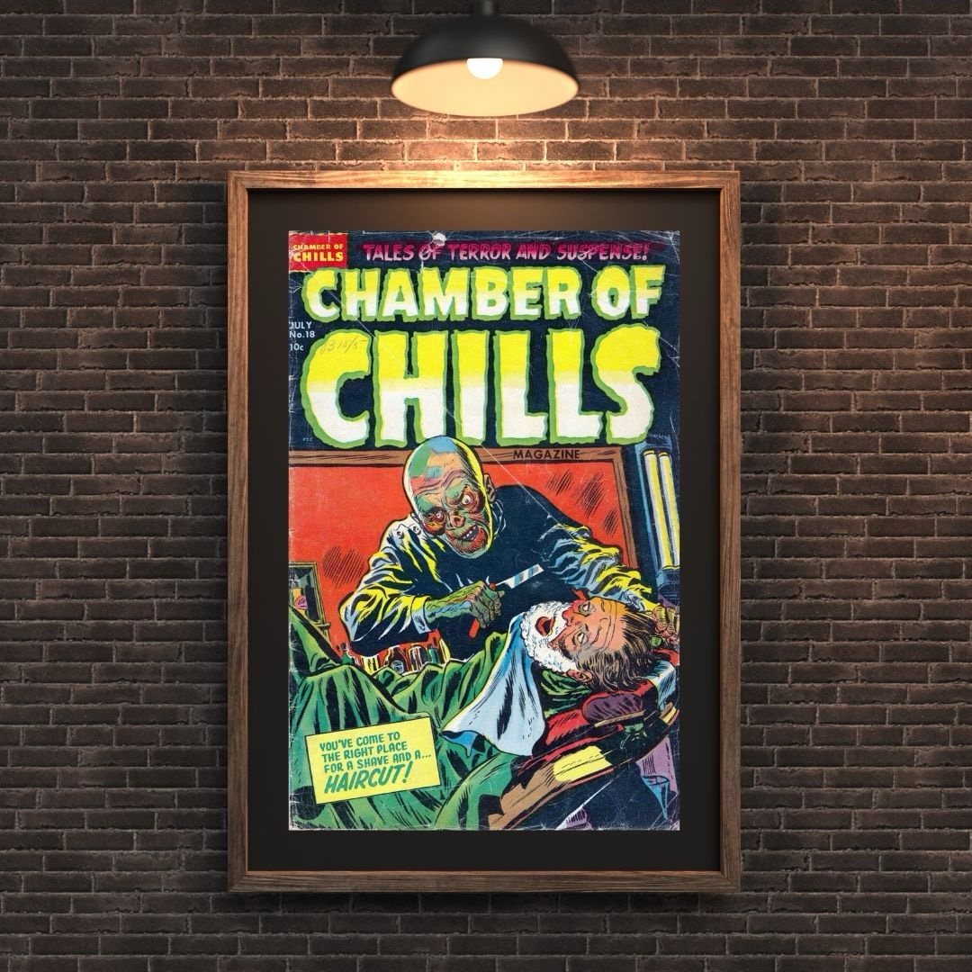 Chamber of Chills No. 18 – “You’ve Come to the Right Place for a Shave and a… Haircut!” Vintage Horror Comic Poster Print