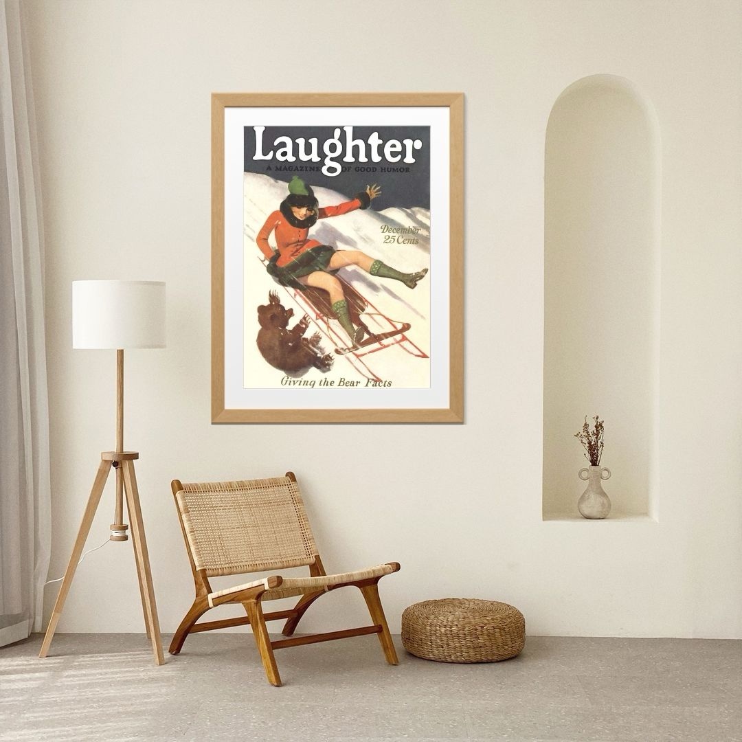 Slip into the roaring twenties with a dash of snow, sass, and slapstick. Giving the Bear Facts is a charming reproduction of the December issue of Laughter: A Magazine of Good Humor—a lighthearted humor periodical that captured the wit and whimsy of its time. This delightful cover illustration features a stylish young woman in a bright red winter coat and green accessories sledding down a snowy hill… only to encounter an adorable (and apparently conversational) bear cub mid-run. The playful title seals the gag: “Giving the Bear Facts.”
