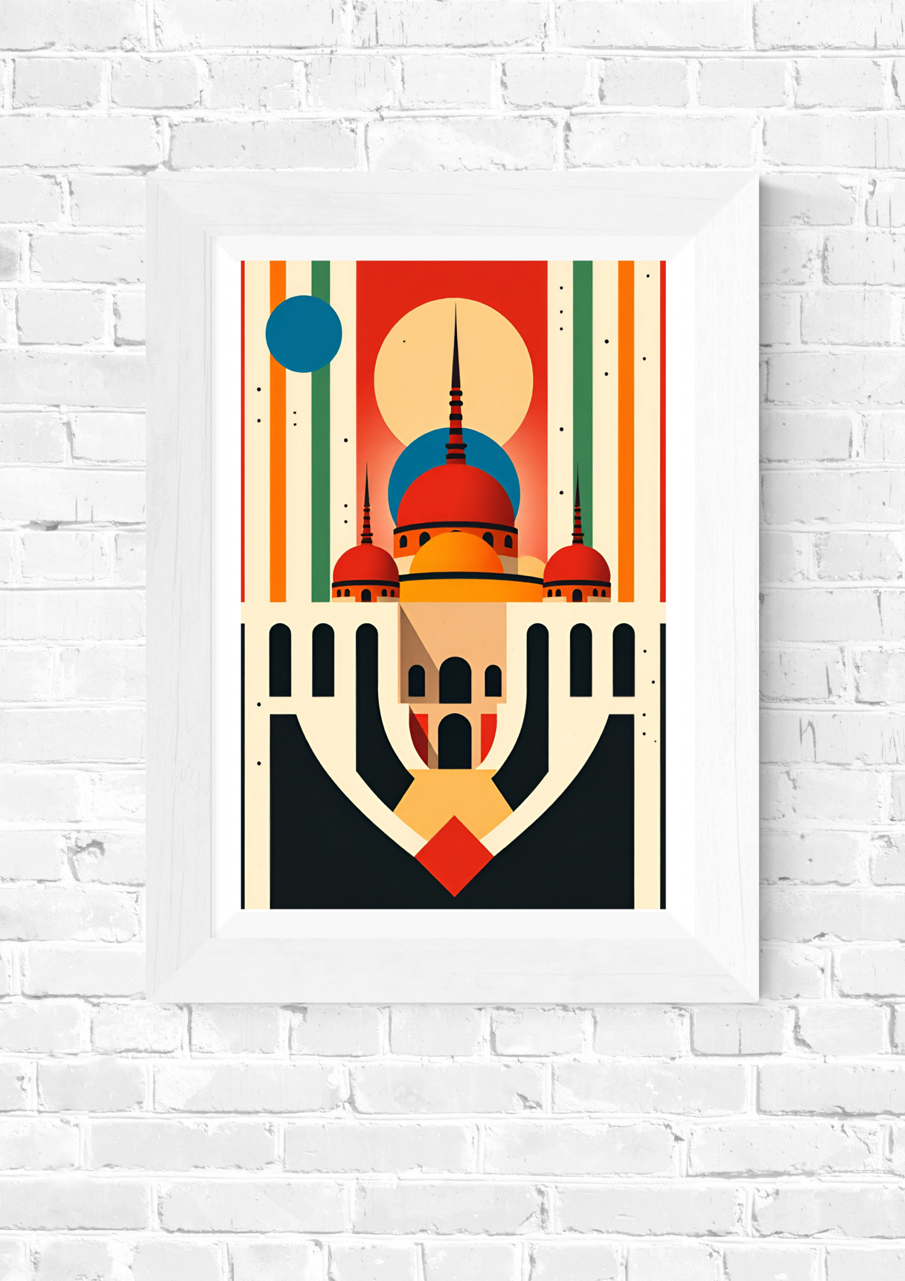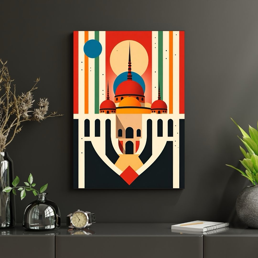 Where ancient silhouettes meet futuristic visions. Desert Spires radiates the bold elegance of geometric architecture distilled into an abstract dreamscape. Towering domes and minarets rise with perfect symmetry against a vibrant backdrop of sun, sky, and space-age stripes. Warm desert tones of ochre, crimson, and terracotta balance dramatically with deep blacks, ivory lines, and celestial pops of teal and blue.