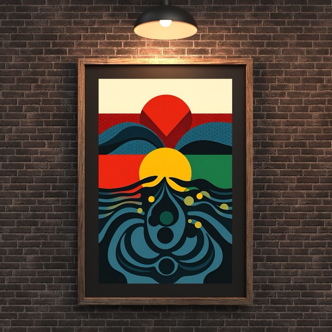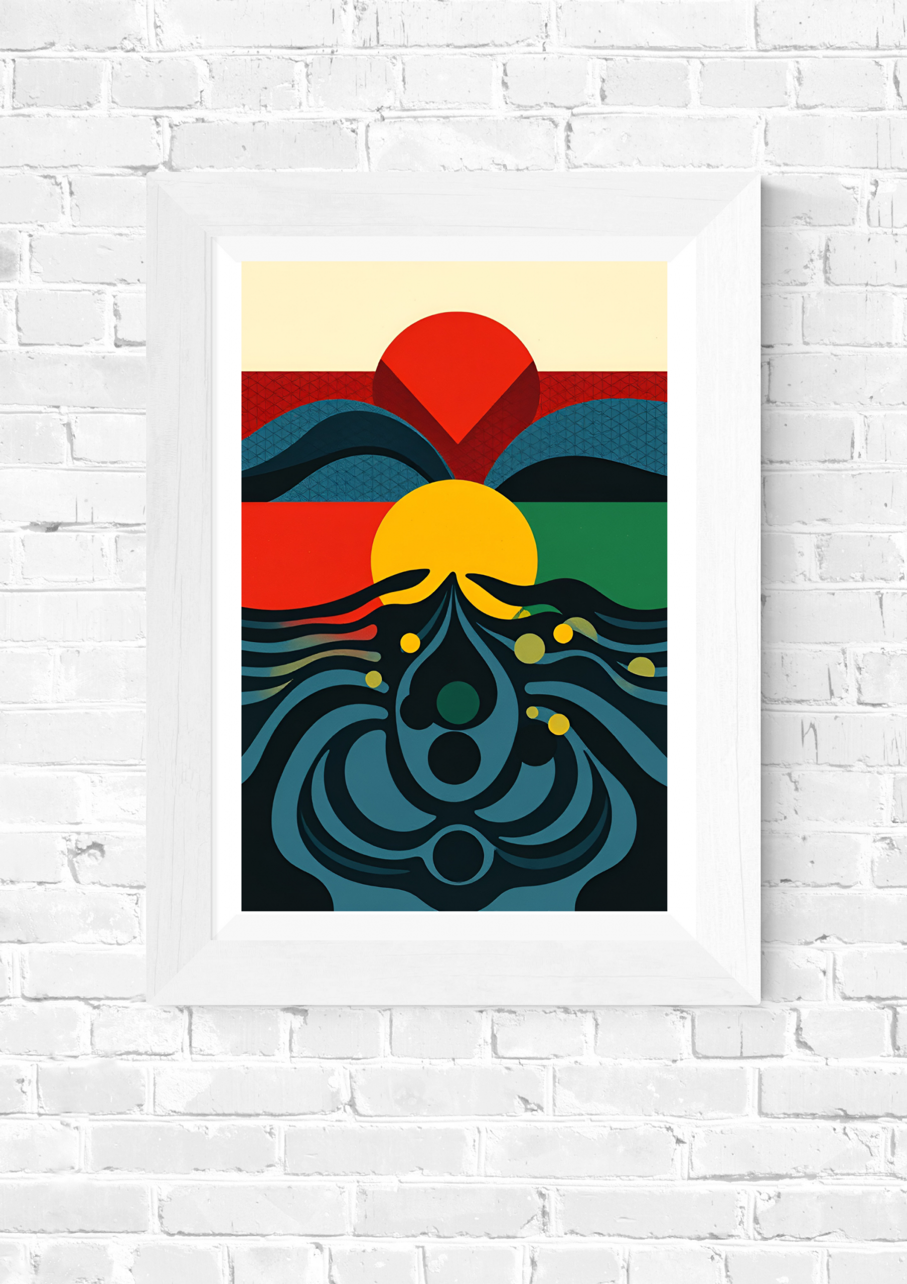 Bold. Rhythmic. Cosmic. Eclipse Rising captures the perfect intersection of geometry and the natural world. With vibrant blocks of red, gold, teal, and green, this piece layers organic waveforms and sharp geometric patterns into a dazzling dance of sun, moon, and horizon. The sun radiates from the center, pulling your eye into the layered depths of the ocean-like curves and the grid-textured mountains above.