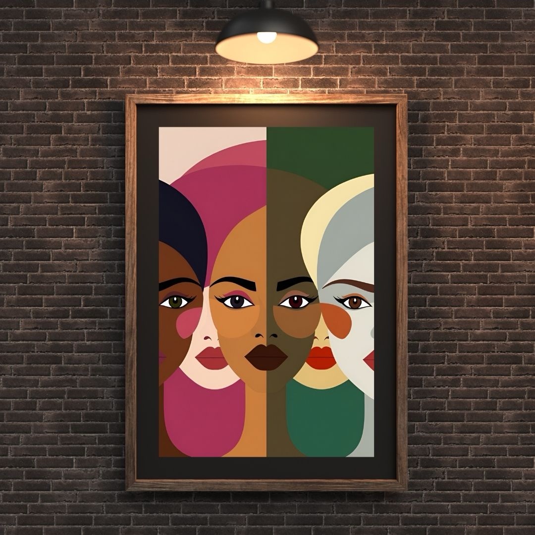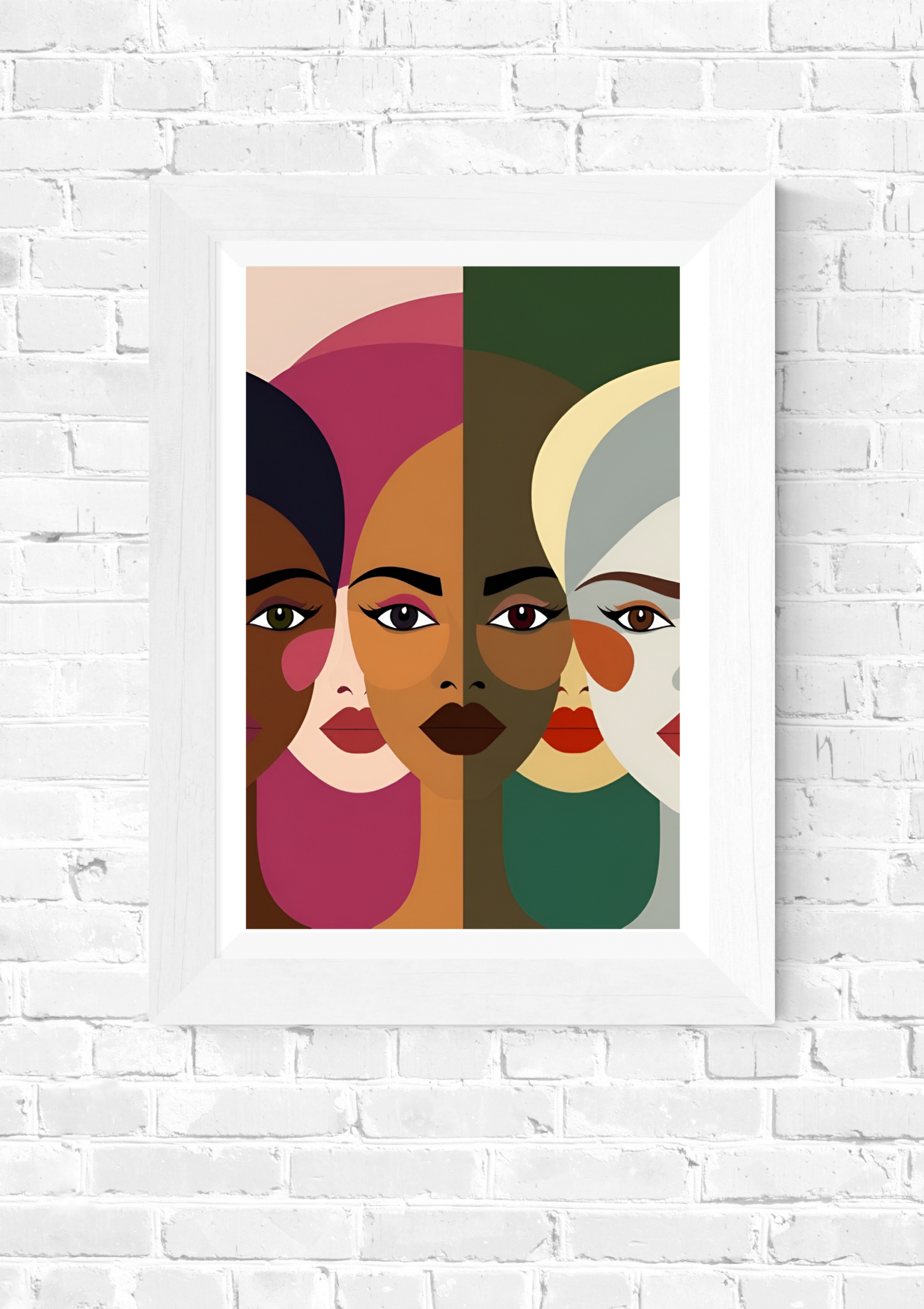 Celebrate the richness of individuality with Spectrum of Beauty, a bold, contemporary tribute to feminine strength and diversity. This striking minimalist portrait features five stylized female faces, each rendered in smooth, overlapping planes of vibrant color and varied skin tones. Sharp brows, expressive eyes, and graphic cheek highlights create a powerful symmetry and balance, turning this piece into a visual anthem of unity and empowerment.