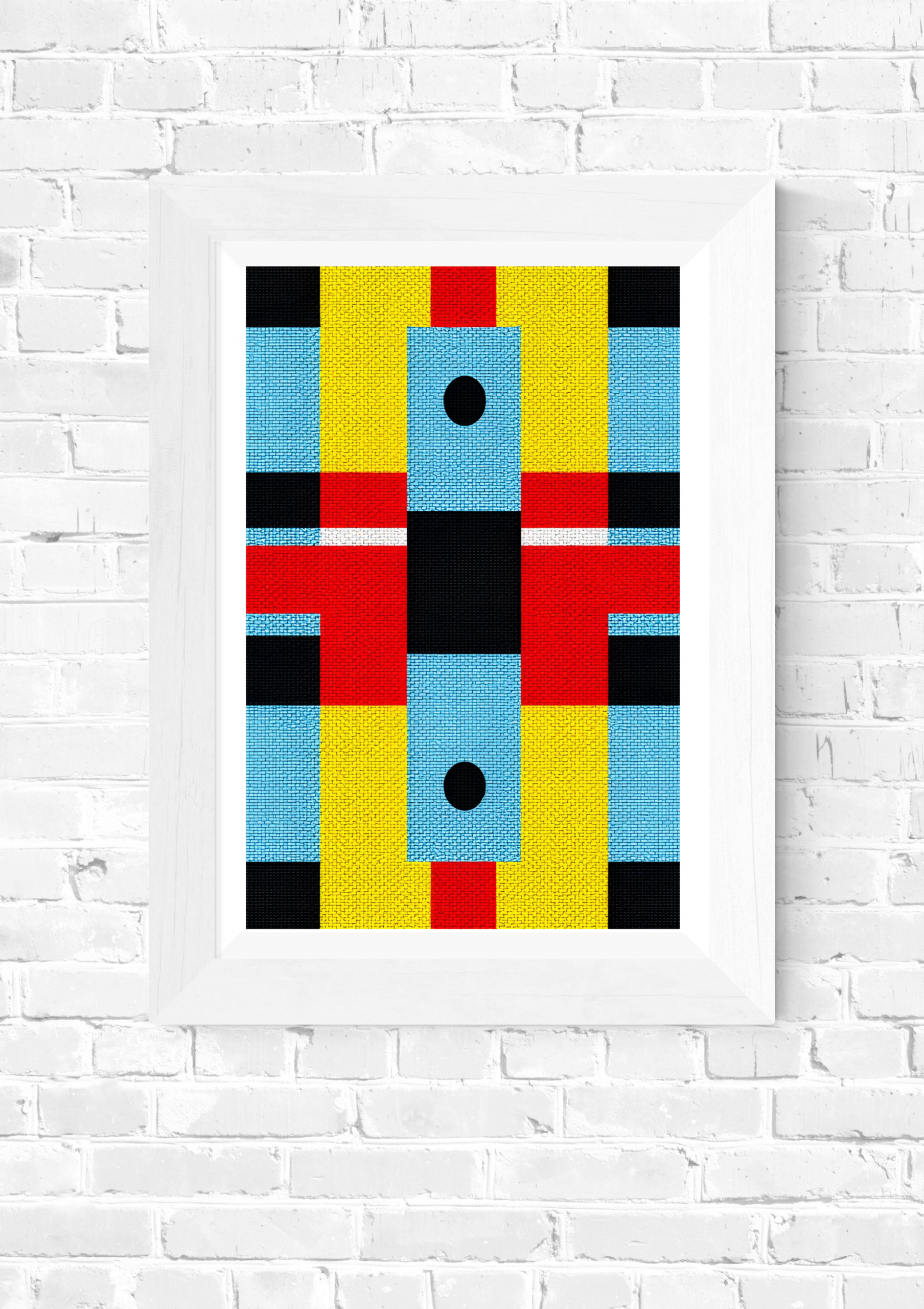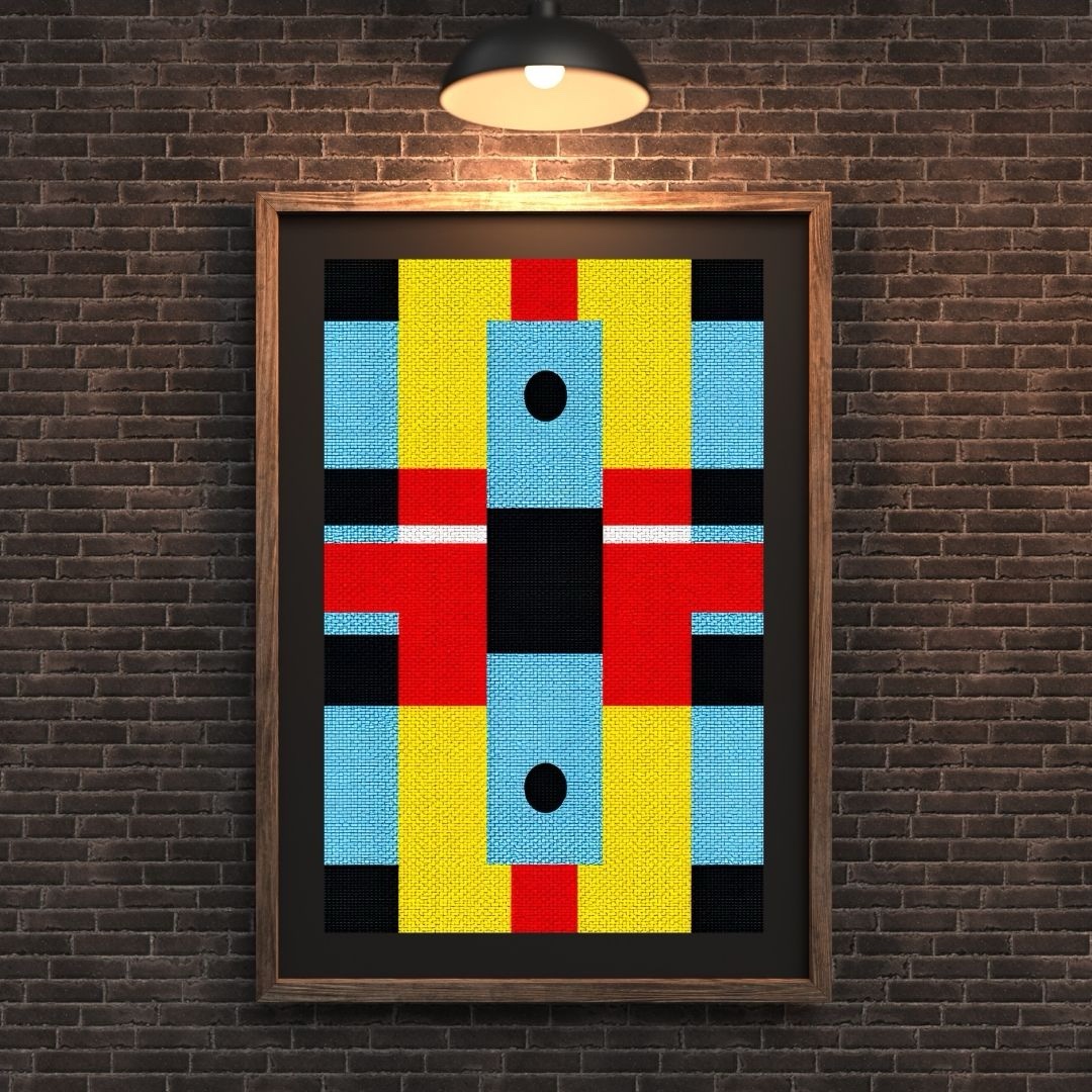 Click. Snap. Buzz. Switchboard is a retro-futurist grid of bold primaries and punctuated precision, where every shape feels like a button begging to be pushed. With alternating blocks of cyan, red, yellow, and black, and perfectly placed circles like signals waiting to transmit, this piece channels both Bauhaus design principles and vintage tech aesthetics with magnetic clarity.