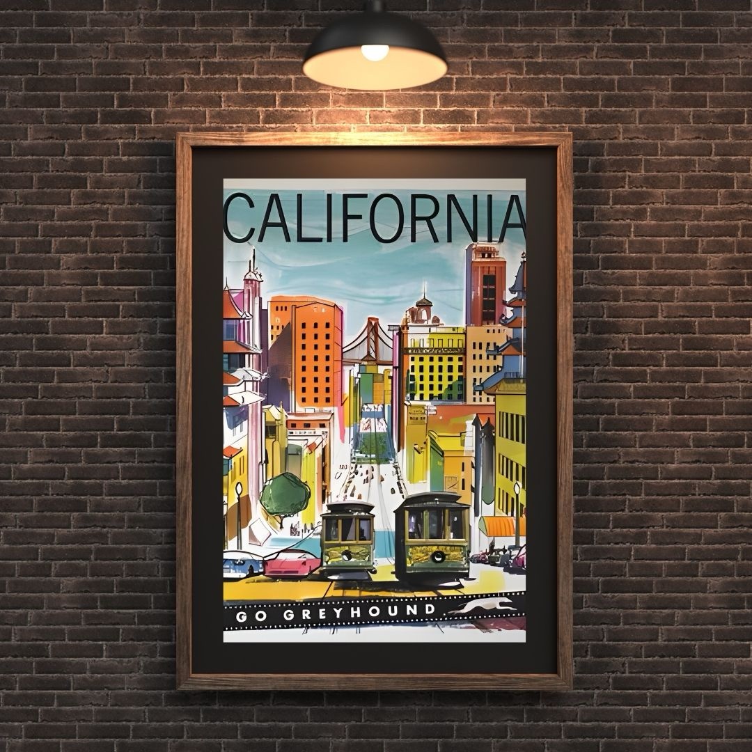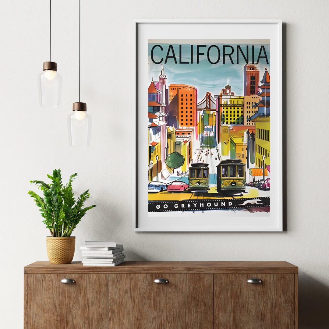 Step aboard a time machine headed straight for the golden age of West Coast wanderlust. California Dreamin’ captures the charm of vintage San Francisco in full technicolor — trolley cars cresting down hills, a golden gate rising in the distance, and the bustling optimism of midcentury architecture.