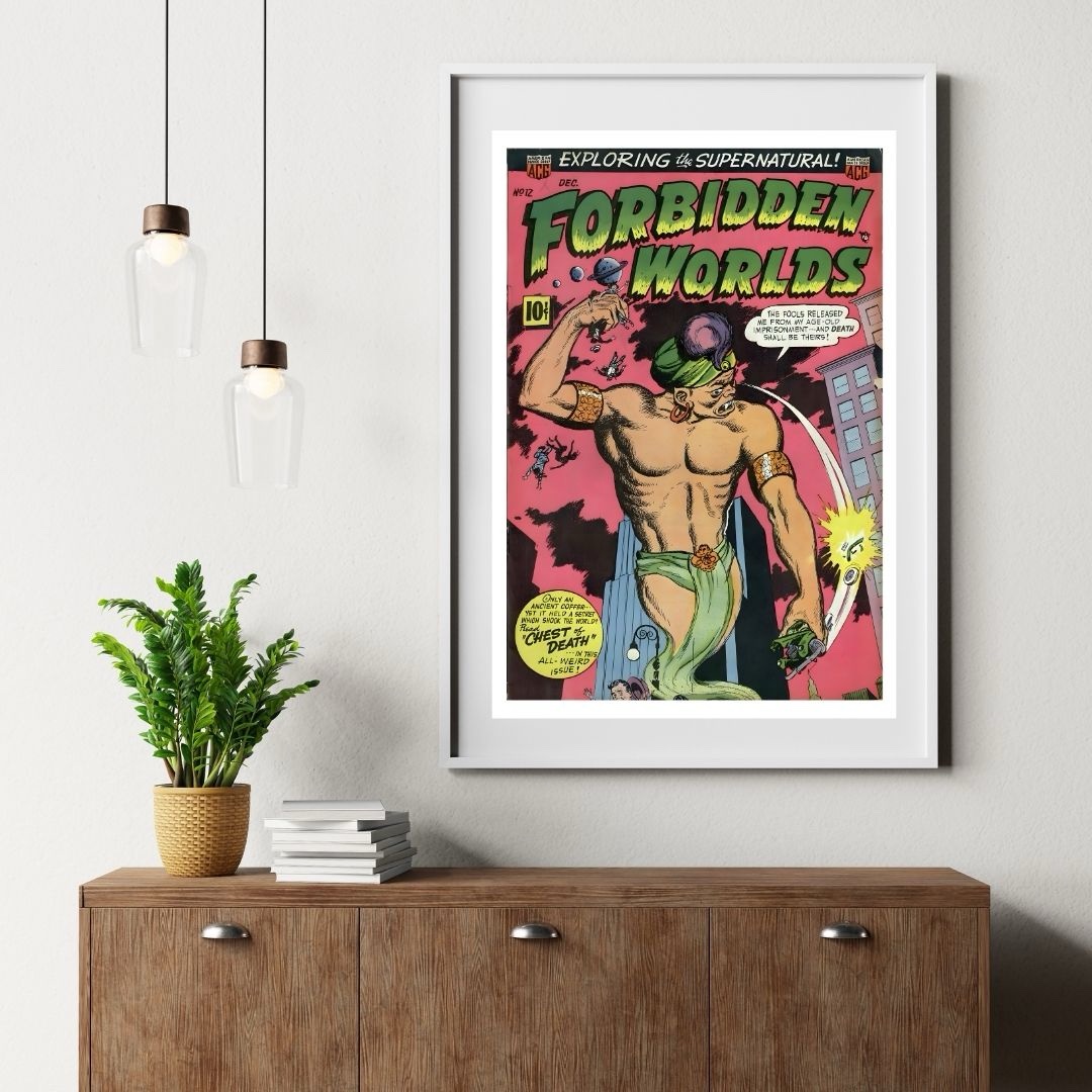 Prepare for a wild journey into the bizarre and uncanny with Forbidden Worlds No. 12—the December issue of American Comics Group’s legendary supernatural series. This thrilling vintage comic cover bursts with action and weird wonder. A towering, musclebound genie (or ancient evil spirit) breaks free of his prison to wreak havoc on an unsuspecting modern city! Bold, vibrant colors and dramatic 1950s comic book style make this an unforgettable tribute to pulp sci-fi and supernatural adventure.