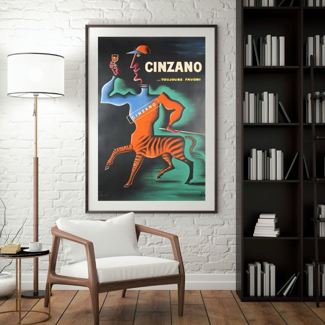 Savor the sophisticated charm of mid-century French advertising with this whimsical Cinzano poster that epitomizes post-war optimism and artistic flair. This playful …Toujours Favori (Always the Favorite) artwork showcases the surrealist influence that transformed French commercial art during the 1940s. The imaginative composition features an elegant gentleman riding a zebra while raising a glass of Cinzano, set against a dreamlike nocturnal landscape in rich blues and vibrant oranges. This fantastical imagery captures the spirit of celebration and joie de vivre that defined French aperitif culture, when advertising became a canvas for artistic experimentation and sophisticated humor.
