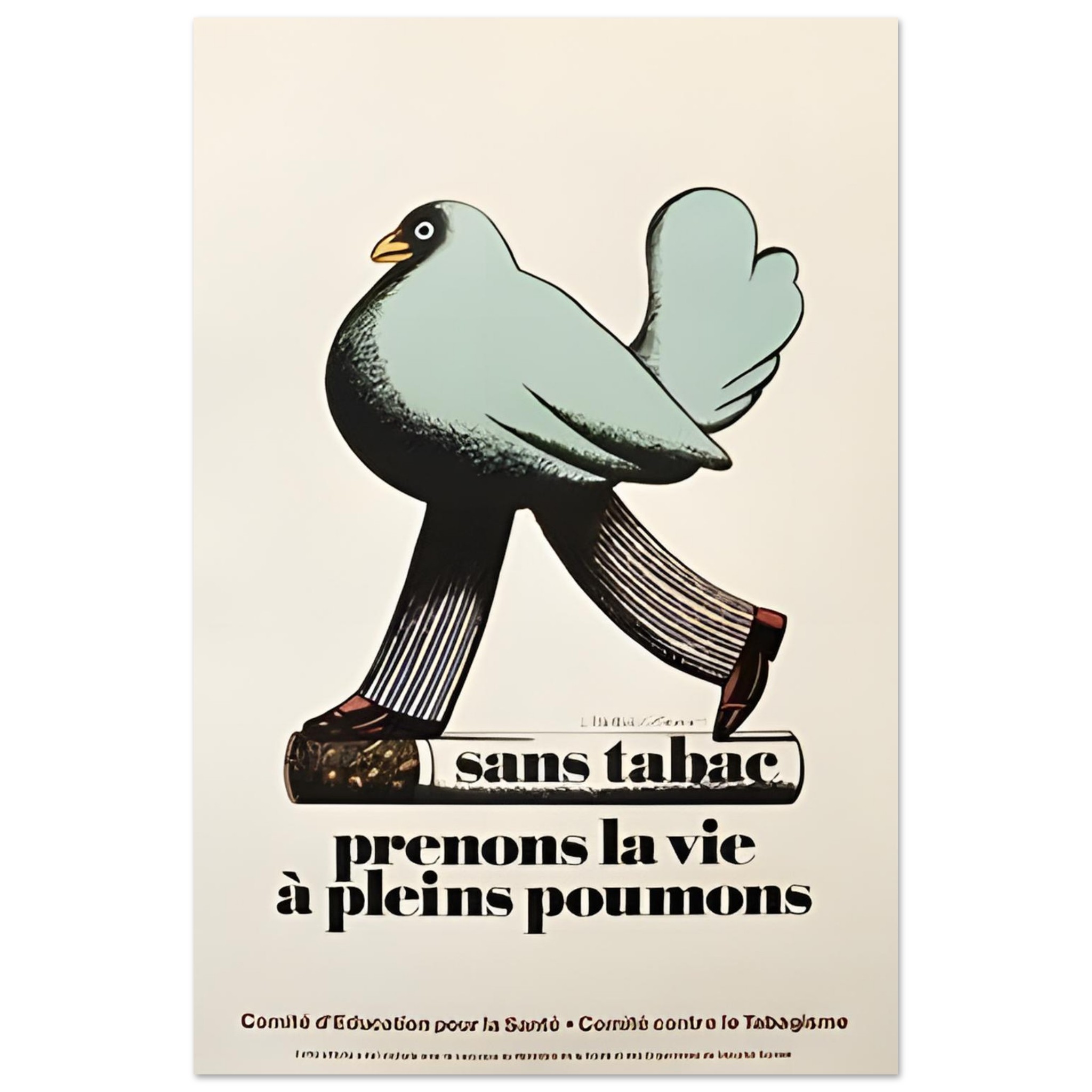The artwork features elegant “SANS TABAC” typography with “PRENONS LA VIE A PLEINS POUMONS” (Let’s Live Life to the Full Lungs) text, showcasing beautiful French graphic design. The central dove symbolizes freedom and health, emphasizing the anti-smoking campaign’s positive messaging about breathing and wellness.