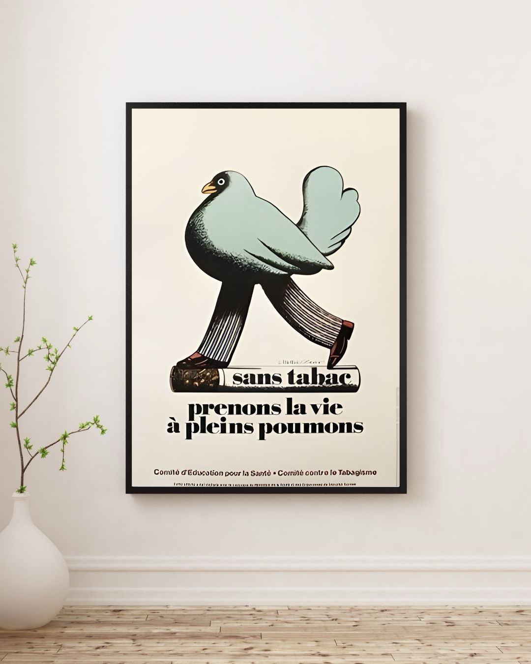 This captivating French health campaign poster print brings the elegance of European public health design into your home. The symbolic dove imagery and inspiring “breathe life fully” message create an uplifting focal point that complements both modern and vintage French interior styles.