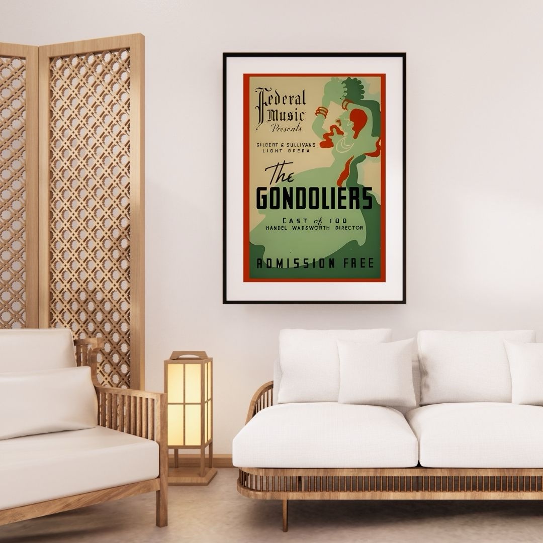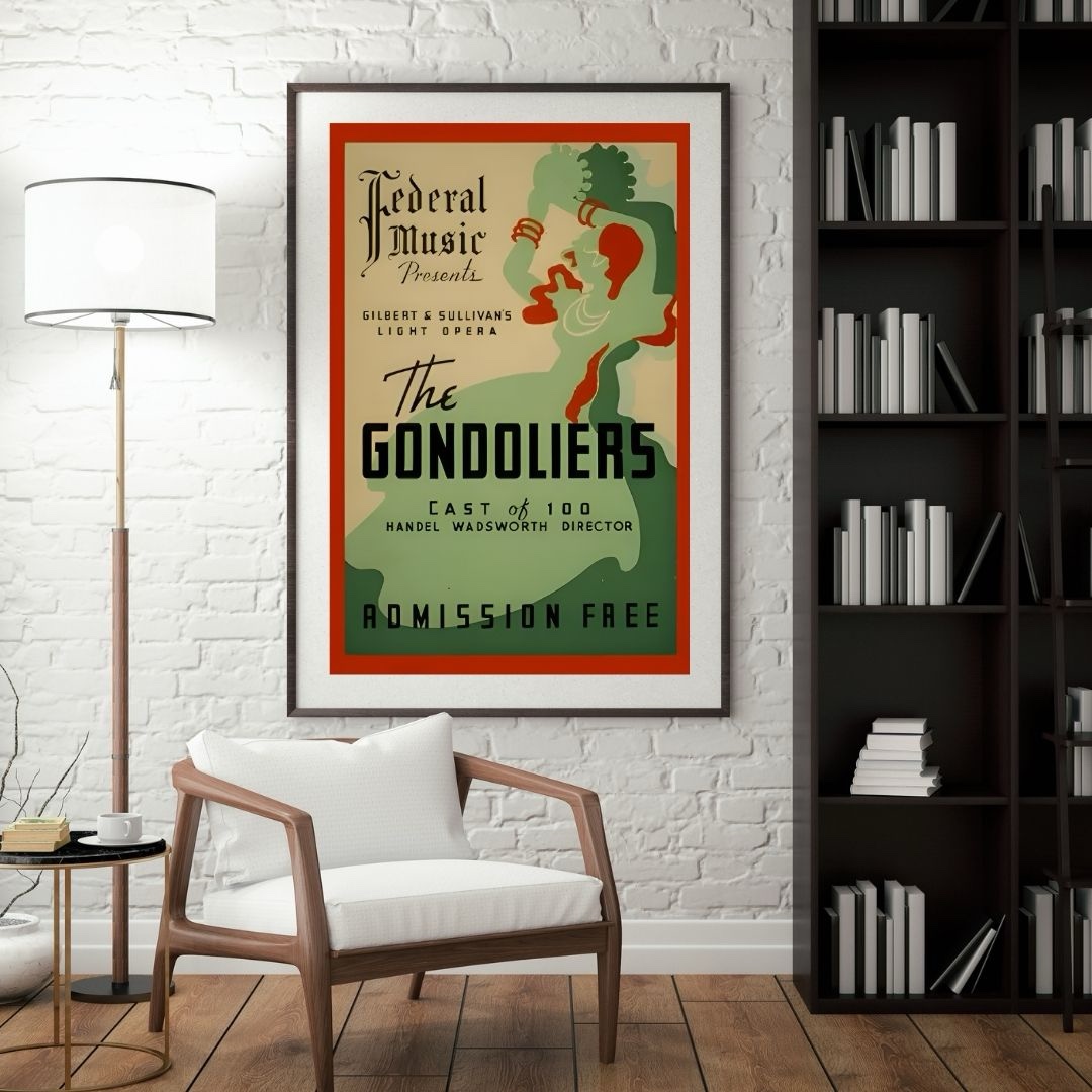 vintage opera poster print, 1930s federal music project art, Gilbert Sullivan gondoliers poster, WPA theater wall art, vintage musical theater decor, art deco opera poster, new deal era artwork, classical music wall decor, vintage americana theater art, historical music poster reproduction